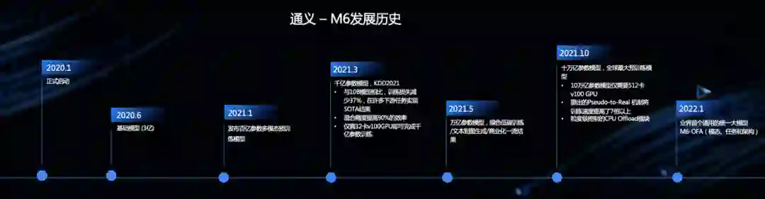 已经从 2020 年 6 月的 3 亿参数基础模型发展到 2021 年 10 月的 10 万亿参数全球最大预训练模型到 2022 年 1 月的业界首个通用统一大模型 M6-OFA。