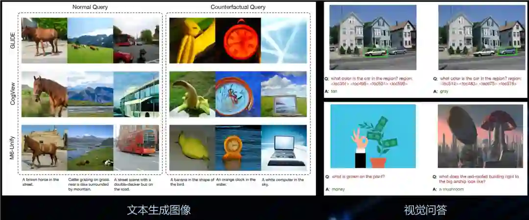 下图展示了 M6-OFA 的 text2Image 和 VQA 任务的跨模态生成结果。