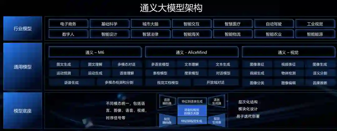 下图为通义大模型整体架构,最底层为统一模型底座,中间基于底座的通用模型层覆盖了通义 - M6、通义 - AliceMind 和通义 - 视觉,专业模型层深入电商、医疗、娱乐、设计、金融等行业。
