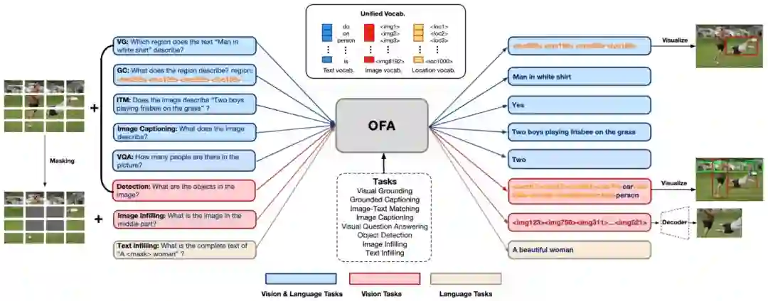 ,通过设计不同的 instruction,M6-OFA 将涉及多模态和单模态(即 NLP 和 CV)的所有任务都统一建模成序列到序列(seq2seq)任务。M6-OFA 覆盖了 5 项多模态任务,分别为视觉定位、定位字幕、图文匹配、图像字幕和视觉问答(VQA);2 项视觉任务,分别为检测和图像填补;1 项文本任务,即文本填补。