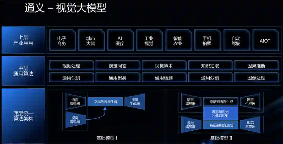 自下往上分为了底层统一算法架构、中层通用算法和上层产业应用。据了解,通用 - 视觉大模型可以在电商行业实现图像搜索和万物识别等场景应用,并在文生图以及交通和自动驾驶领域发挥作用。