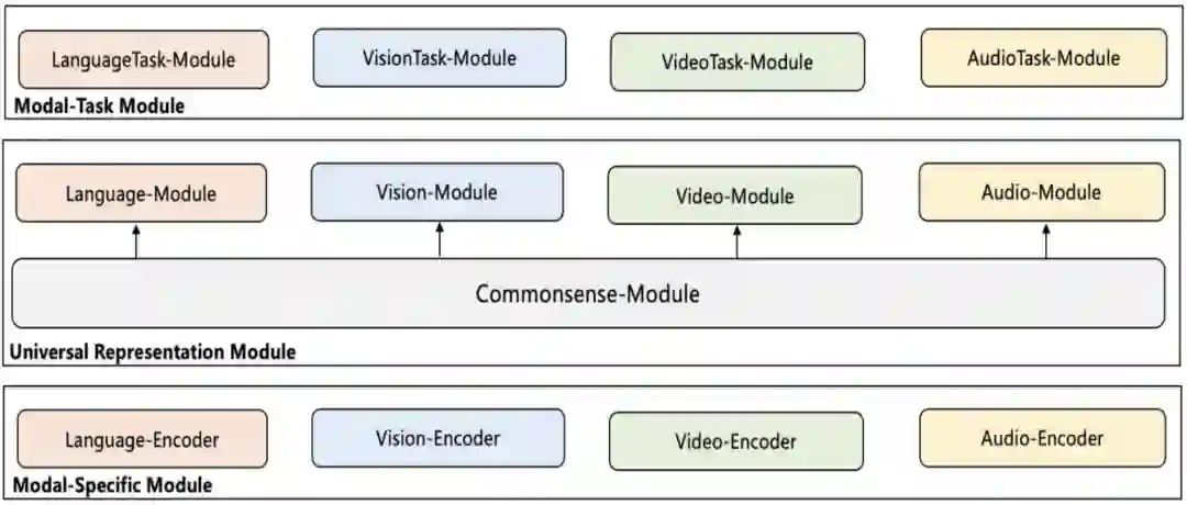 ,其模态模块涵盖语言、视觉、音频和视频——底部输入层接收各自模态信息,中间层通过跨模态信息融合学习统一语义表示,往上再划分为针对不同模态的具体下游任务。