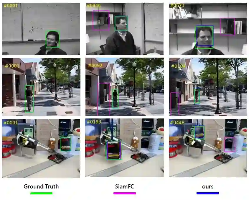 最左边的一列图片中用绿色边界框给出了需要跟踪的目标,后两列的图片展示了在不同的后续帧中的跟踪结果。其中紫色框标出的是SiamFC的结果。在第一行的例子中,目标物体是人的头部,在边界框的右上角是颜色较深的头发,剩余大部分区域是颜色较浅的面部区域。因此,在中间列所展示的图片中,SiamFC给出了背景中符合这种灰度模式的一片区域作为跟踪结果。类似的错误也发生在第二行、第三行所展示的示例中。事实上,前两个例子中的目标物体都具有很强的语义信息,即人的头部和人体。如果跟踪器能够从第一个边界框中提取出语义信息,并且用语义信息进行匹配,那么这两个序列中的背景干扰问题就迎刃而解了。
