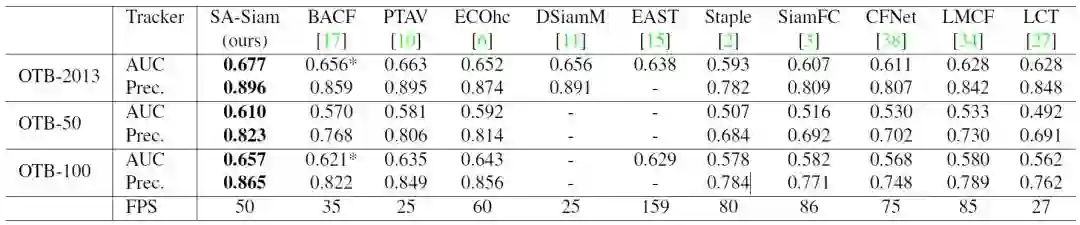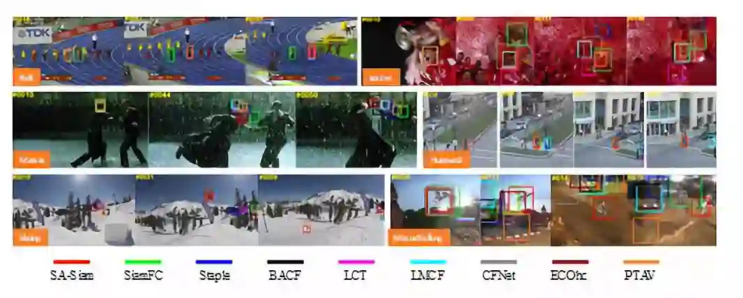 下图中展示了SA-Siam和其它实时跟踪器在几个典型视频序列上的表现,其中SA-Siam的跟踪结果由红色边界框给出。在所有展示的视频中,SA-Siam都取得了良好的跟踪效果,实现了“能跟住”、“不跟错”和“实时跟”。特别值得一提的是最后一行的两个视频,在Skiing序列中跟踪目标是一个从高台飞跃而下的滑雪运动员。由于跟踪目标小、形态变化大、移动速度快,在SA-Siam之前几乎所有的实时跟踪器都在这个序列上失败了。而SA-Siam由于加入了相对稳定的语义信息,无论滑雪者的外观、形态如何变化,跟踪起来都非常顺利。最后一个MotorRolling的序列和Skiing序列有些相似,但目标物体的尺度变化更大,其它跟踪器都不出意外的跟丢了,而SA-Siam却能稳定的追踪到目标。