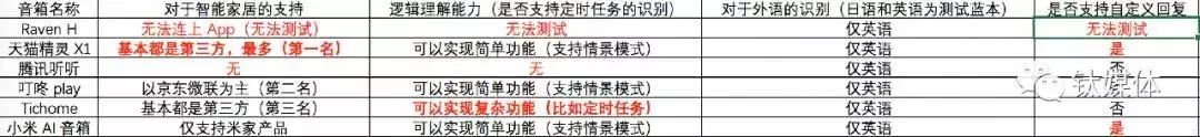 需要靠近音箱才行,但是同样的,这六款设备都无法实现唤醒词的自定义,这可能是出于唤醒成功率的考虑。这些智能音箱同时也会对视频或者音频中的人声唤醒有反应。当然,这些音箱也会偶尔出现误唤醒的状况,比如莫名其妙的响应,其中 Tichome,Raven H 和小米 AI 音箱出现的次数最多。最尴尬的是,钛媒体在使用其他智能音箱播放歌曲的时候,甚至会激活其他智能音箱。