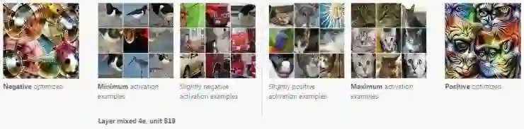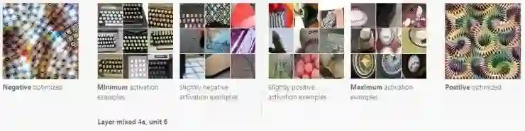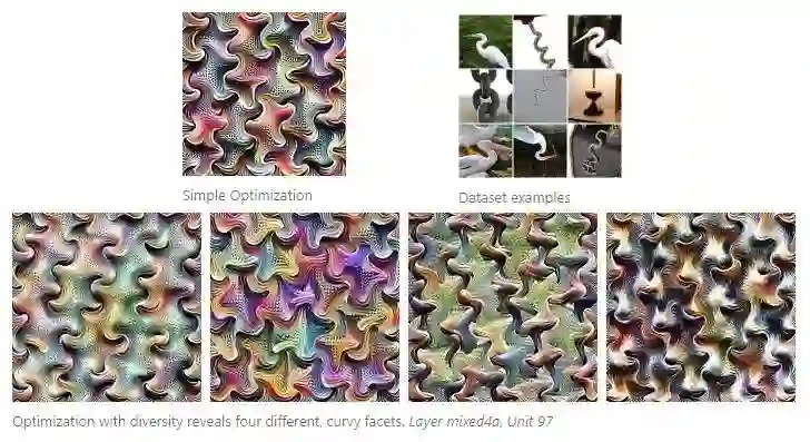 多样化的特征可视化结果可以更清晰地看到是哪些结构能够激活神经元,而且可以和数据集中的照片样本做对比,确认研究员们的猜想的正确性(这反过来说就是上文中理解每层网络的优化结果时有时需要依靠多样化的样本和数据集中的样本)。