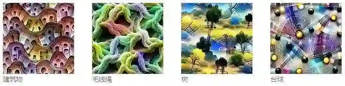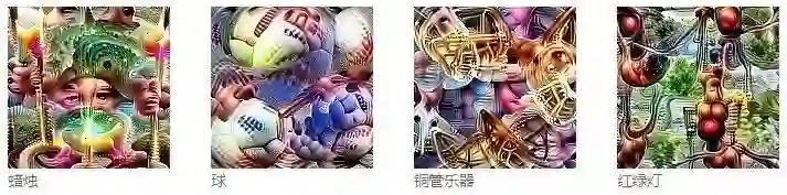 对更高级别的神经元来说,多种不同类别的物体都可以激活它,优化得到的结果里也就会包含这各种不同的物体。比如下面的图里展示的就是能对多种不同的球类都产生响应的情况。
