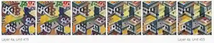 这一层中有更复杂的概念,比如第一张图里的某种动物的口鼻部分。另一方面,也能看到一些神经元同时对多个没什么关系的概念产生响应。这时需要通过优化结果的多样性和数据集中的样本帮助理解神经元的行为。