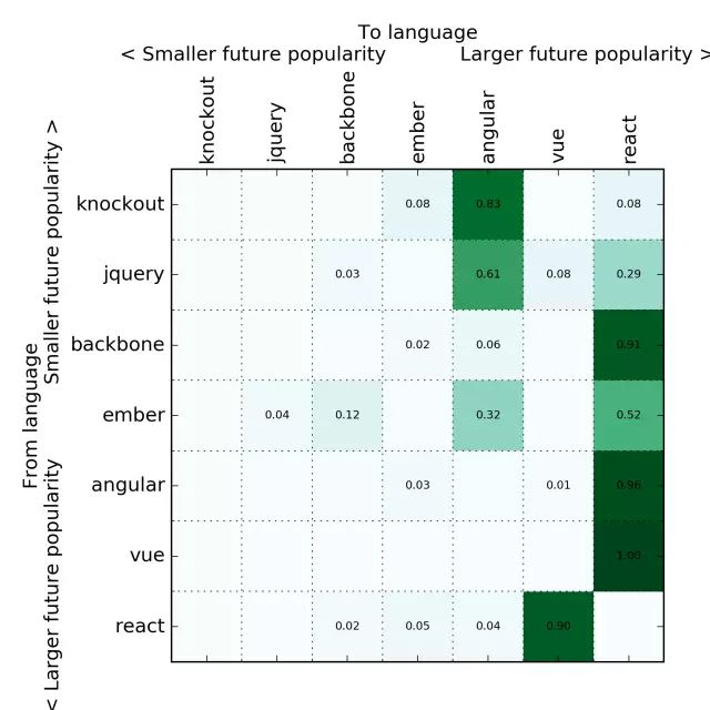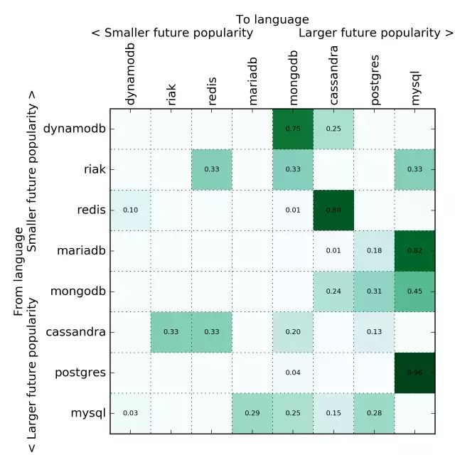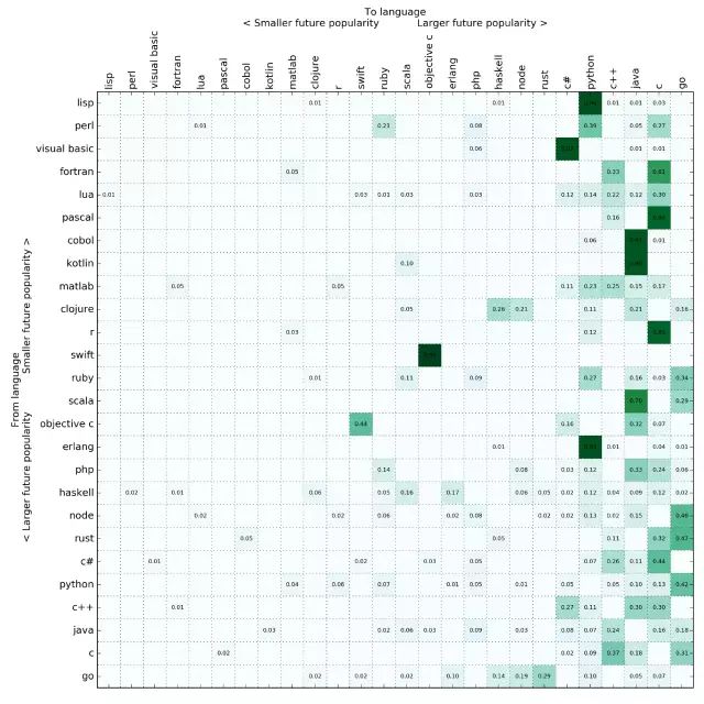 根据未来流行度,我把转移矩阵按照编程语言做了排序(根据第一特征向量所做的预测)