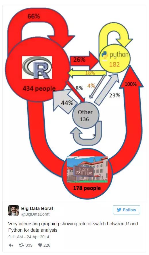 这图非常有意思,展示了在数据分析中 R 和 Python 之间的转化率。