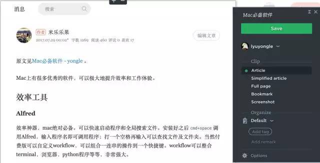 看到一篇好文章,保存链接不放心,怕链接失效,复制粘贴又太麻烦。推荐使用 Evernote Web Clipper ,直接保存富文本格式的文章,还能去除广告,好用。