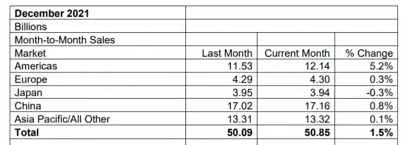 与2020年12月相比,2021年12月美洲半导体销量涨幅达到5.2%,中国0.8%,欧洲0.3%,亚太地区0.1%,日本下跌0.3%。