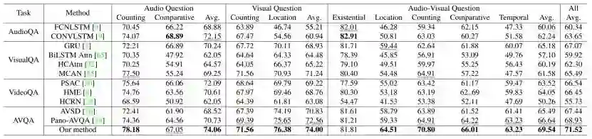 近年来,研究人员在声音对象感知、音频场景分析、视听场景解析和内容描述等方面取得了显著进展。尽管这些方法能将视觉对象与声音关联,但它们中的大多数在复杂视听场景下的跨模态推理能力仍然有限。相比之下,人类可以充分利用多模态场景中的上下文内容和时间信息来解决复杂的场景推理任务,如视听问答任务等。现有的视觉问答(VQA)和声音问答(AQA)方法等往往只关注单一模态,从而不能很好的在真实的视音场景中进行复杂的推理任务。