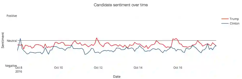 特朗普和希拉里在 Twitter 上的情感分析(图像来源:https://monkeylearn.com/blog/donald-trump-vs-hillary-clinton-sentiment-analysis-twitter-mentions/)。