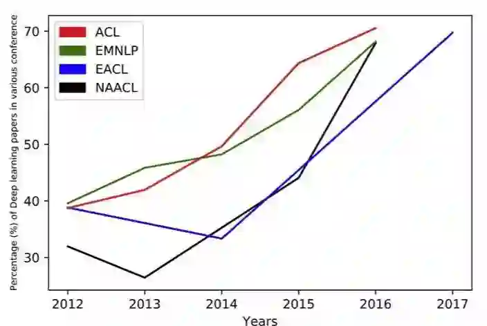 不可否认,用于解决 NLP 问题的 DL 技术持续发展。一个重要指标就是近年深度学习论文在重要的 NLP 会议如 ACL、EMNLP、EACL、NAACL 上的比例。
