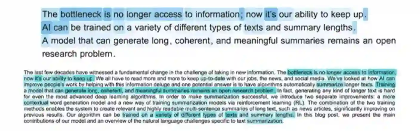 近年来,基于 RNN 的模型在文本生成领域获得了惊人成绩。它们在短输入和输出文本上效果非常好,但对长文本的处理不太好,不连贯且会重复。Paulus et al. 在论文中提出一种新的神经网络模型来克服该局限。结果很好,如下图所示。