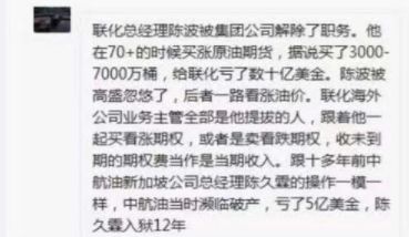 “联化总经理陈波在原油价格70+的时候买涨原油期货,据说买了3000—7000万桶,给联化亏了数十亿美金。陈波被高盛忽悠了,高盛此前一路看涨油价。”