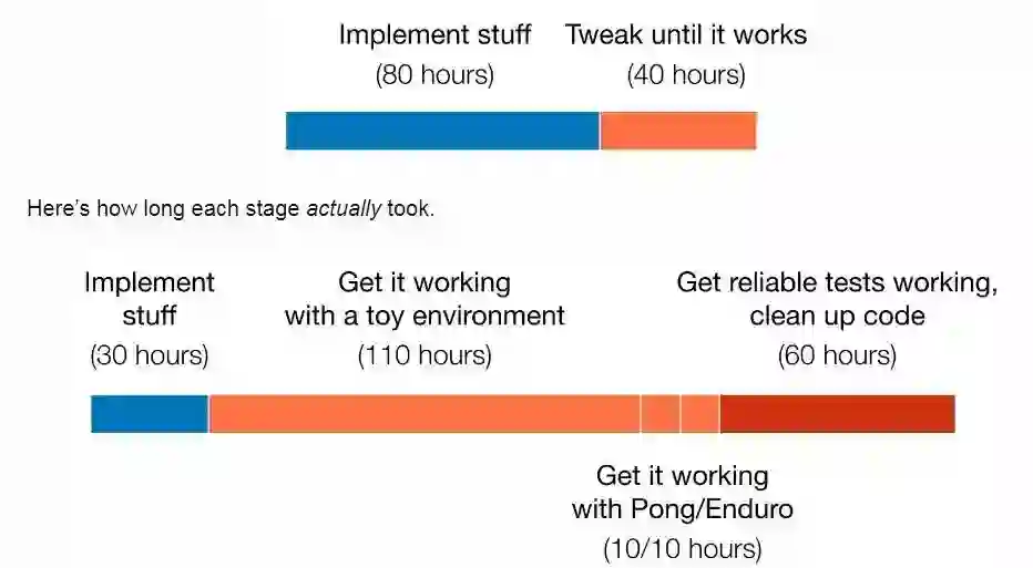 另一位DRL研究者Matthew Rahtz则通过讲述自己试图复现一个DRL算法的坎坷历程来回应Alexirpan,让大家深刻体会了复现DRL算法有多么难[15]。半年前,Rahtz出于研究兴趣,选择对OpenAI的论文Deep Reinforcement Learning from Human Preferences进行复现。在复现的过程中,几乎踩了Alexirpan总结的所有的坑。他认为复现DRL算法与其是一个工程问题,更不如说像一个数学问题。“它更像是你在解决一个谜题,没有规律可循,唯一的方法是不断尝试,直到灵感出现彻底搞明白。……很多看上去无关紧要的小细节成了唯一的线索……做好每次卡住好几周的准备。”Rahtz在复现的过程中积累了很多宝贵的工程经验,但整个过程的难度还是让他花费了大量的金钱以及时间。他充分调动不同的计算资源,包括学校的机房资源、Google云计算引擎和FloydHub,总共花费高达850美元。可就算这样,原定于3个月完成的项目,最终用了8个月,其中大量时间用在调试上。
