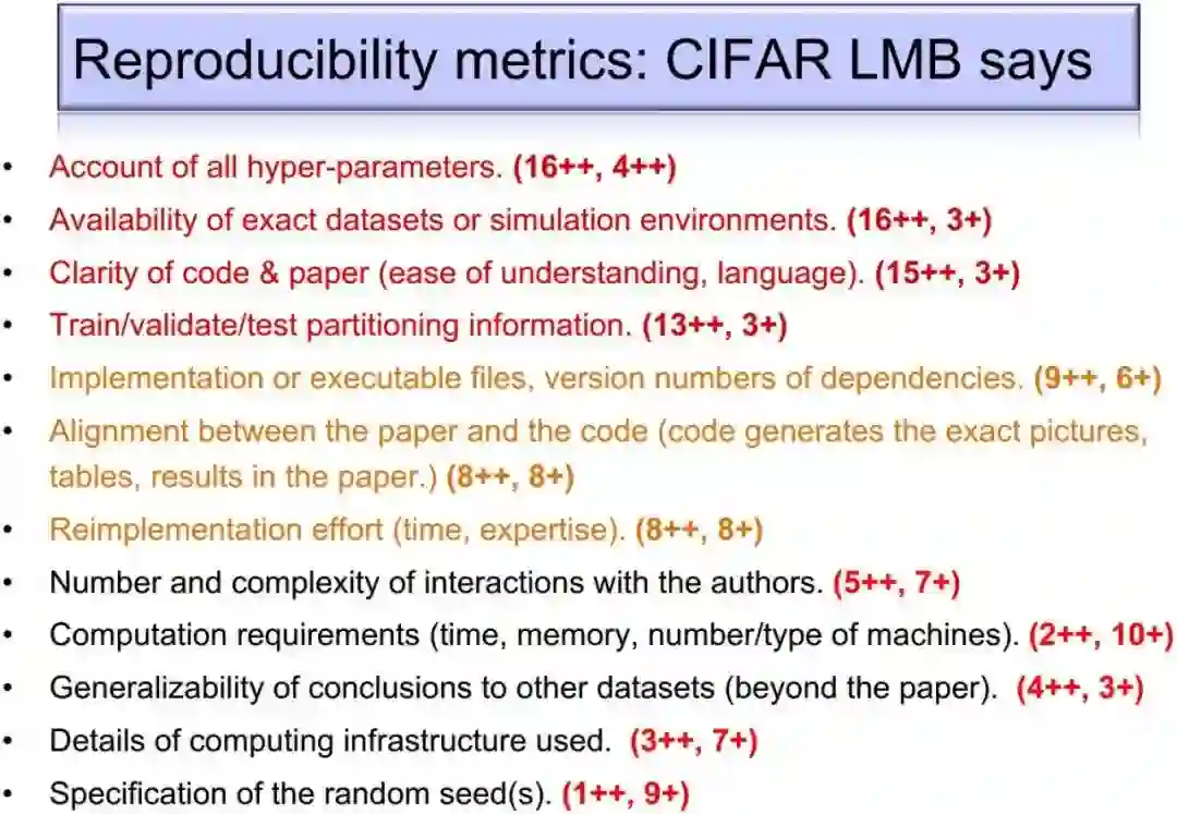 随后,针对DRL领域,Pineau展示了该研究组对当前不同DRL算法的大量可复现性实验。实验结果表明,不同DRL算法在不同任务、不同超参数、不同随机种子下的效果大相径庭。在报告后半段,Pineau呼吁学界关注“可复现性危机”这一问题,并根据她的调研结果,提出了12条检验算法“可复现性”的准则,宣布计划在ICLR 2018开始举办“可复现实验挑战赛”(“可复现危机”在其他机器学习领域也受到了关注,ICML 2017已经举办了Reproducibility in Machine Learning Workshop,并将在今年继续举办第二届),旨在鼓励研究者做出真正扎实的工作,抑制机器学习领域的泡沫。Pineau&Precup研究组的这一系列研究获得了广泛关注。