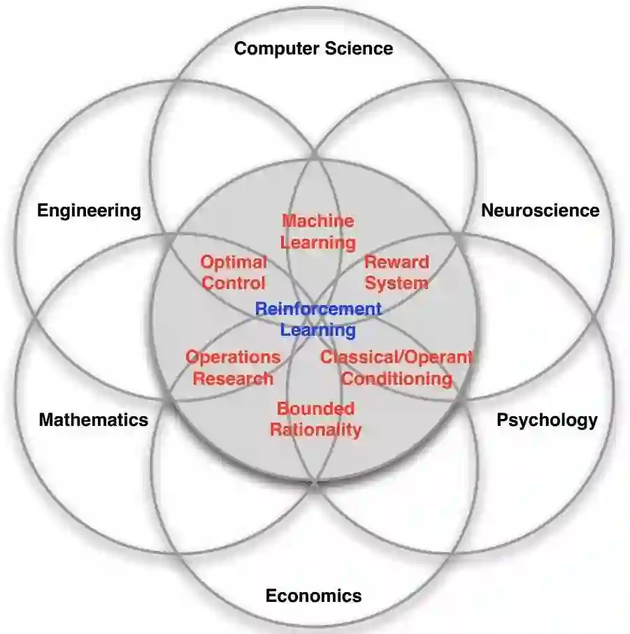 机器学习是个跨学科的研究领域,而RL则是其中跨学科性质非常显著的一个分支。RL理论的发展受到生理学、神经科学和最优控制等领域的启发,现在依旧在很多相关领域被研究。在控制理论、机器人学、运筹学、经济学等领域内部,依旧有很多的学者投身RL的研究,类似的概念或算法往往在不同的领域被重新发明,起了不同的名字。