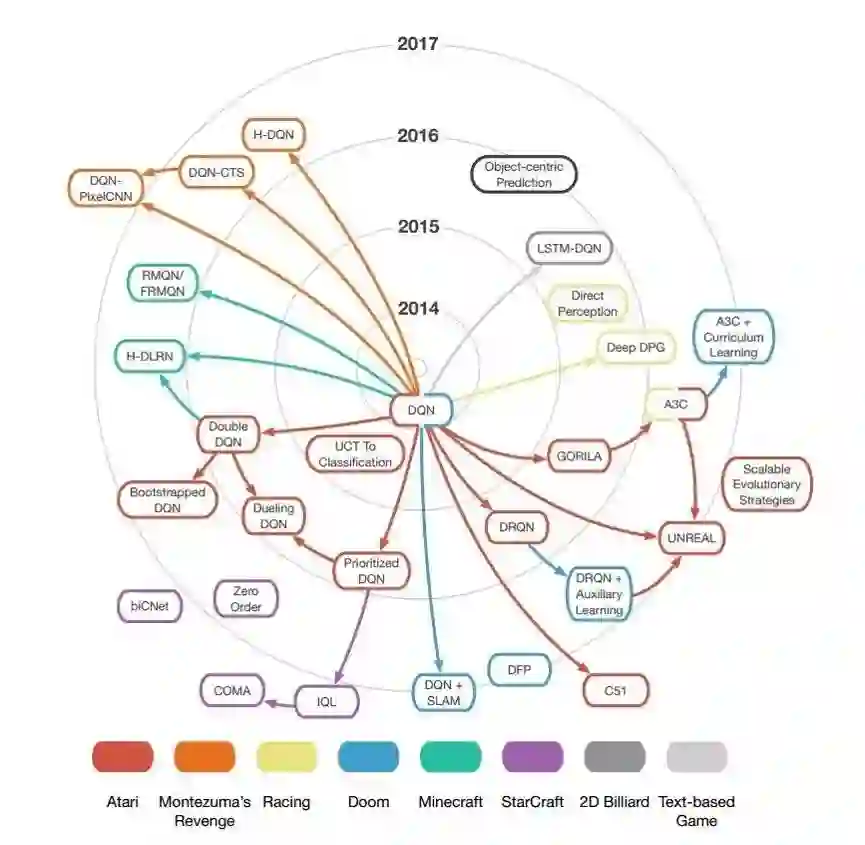 回到人工智能领域。DL取得成功后,与RL结合成为DRL。知识库相关的研究取得成功后,RL算法中也逐渐加入了Memory机制。而变分推理也已经找到了与RL的结合点。近期学界开始了反思DL的热潮,重新燃起对因果推理与符号学习的兴趣,于是也出现了关系RL和符号RL[66]相关的工作。通过回顾学术的发展,我们也可以总结出人工智能发展的一个特点:每当一个相关方向取得突破,总是会回归到RL问题,寻求与RL相结合。与其把DRL看作DL的拓展,不如看作RL的一次回归。因此我们不必特别担心DRL的泡沫,因为RL本就是人工智能的最终目标,有着旺盛的生命力,未来还会迎来一波又一波的发展。