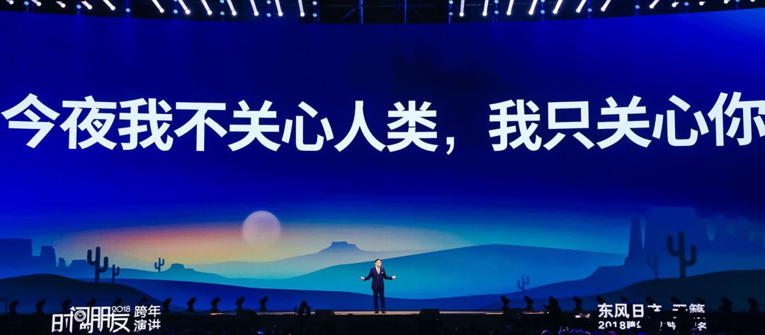 往年的跨年演讲,主题往往非常宏大,从商业世界明星公司的兴衰起落,到中国经济在全球的位置。而这一年的跨年演讲,主题转向了个人。从关心宏观转向关心微观,从关心时代转向关心时代下的个体命运,正是“今夜我不关心人类,我只想你”。只不过,罗胖说:一个胖子说想你,有点煞风景。于是,这句诗在演讲中变成了“今夜我不关心人类,我只关心你”。