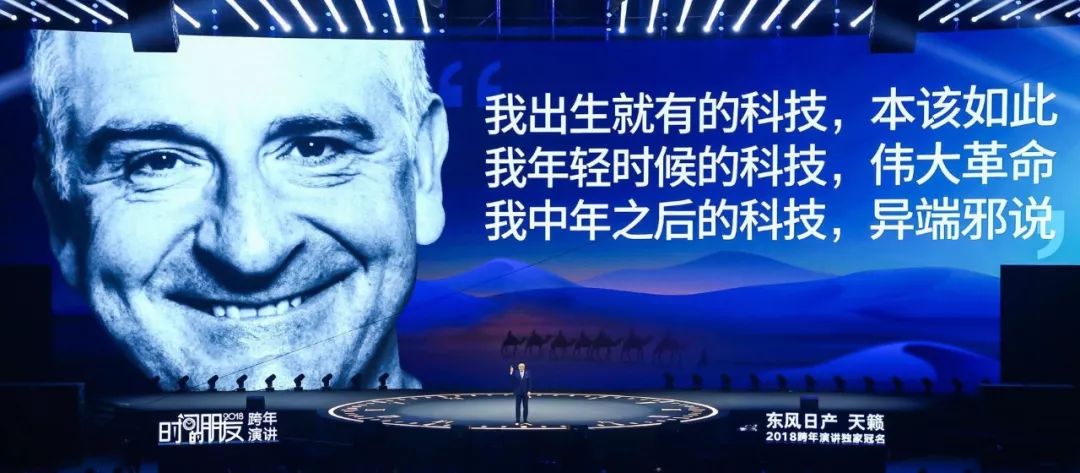 跨年演讲引用了亚当斯讽刺性的科技三定律——“任何在我出生时已经有的科技,都是稀松平常的世界本来秩序的一部分。任何在我15-35岁之间诞生的科技,都是将会改变世界的革命性产物。任何在我35岁之后诞生的科技,都是违反自然规律要遭天谴的。”