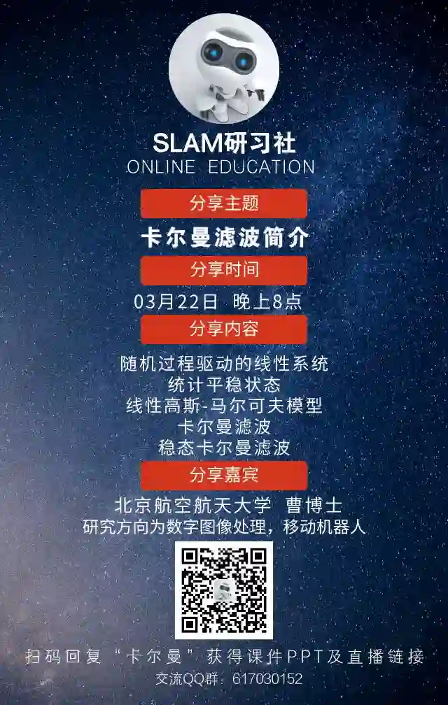 计算机视觉life的小伙伴们大家好,前两周我们讲过了SLAM的前端和基础,本周研习社给大家带来的是后端优化中的经典优化理论之一:卡尔曼滤波,依然由我们耐心细致的曹博士为大家直播,欢迎来捧场!