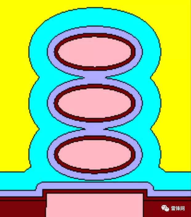 这就是为什么高通团队选择他们的纳米设计,而不是 IBM 的 Nanosheets。雷锋网了解到,高通将之称为 Nanoslabs。从侧面看, Nanoslabs 看起来像一堆两到三个长方形的硅板,每个平板被一个高k介电和一个金属栅极包围,栅极电压在硅中产生电场,从而使电流流过。