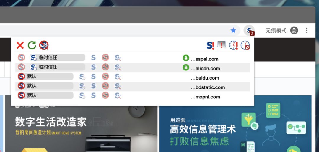 NoScript 是 Firefox 上知名的隐私保护扩展,近期移植到了 Chrome 上,作用是禁止加载 JavaScript、Flash、Silverlight 等可能收集你个人信息的脚本,让你的浏览更加安全。不过,由于 JavaScript 已然成为了网页标配,禁用后会导致大多数网站无法正常访问,需要一段时间的白名单调教后才能正常使用。