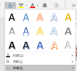 输入要制作倒影的文字,然后点击【开始】-【字体】-【文字效果和版式】按钮,在弹出的菜单中选择“映像”命令,在子菜单中选择需要的倒影样式就完成了。