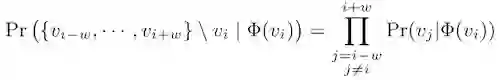 其中v_i是中心词(对应于网络中的target node),v_(i-w),···,v_(i+w)是上下文单词(对应于网络中的N阶近邻的node)。在独立分布的假设下,可以简化为: