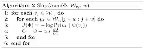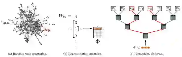①构建同构网络,从网络中的每个节点开始分别进行Random Walk 采样,得到局部相关联的训练数据; ②对采样数据进行SkipGram训练,将离散的网络节点表示成向量化,最大化节点共现,使用Hierarchical Softmax来做超大规模分类的分类器;
