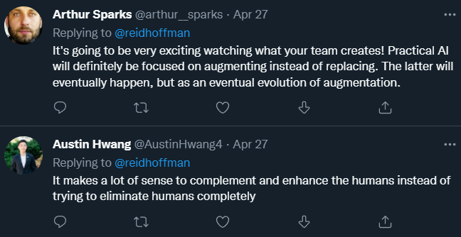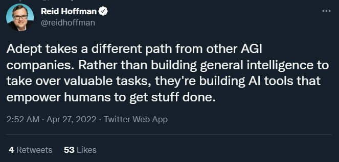从这则博客中我们可以看出,Adept 虽然也宣称要实现 AGI,但他们选择的是一条不同的道路,即先不着急用 AI 取代人类,而是致力于用 AI 来增强人类的能力,这听起来似乎更容易实现。
