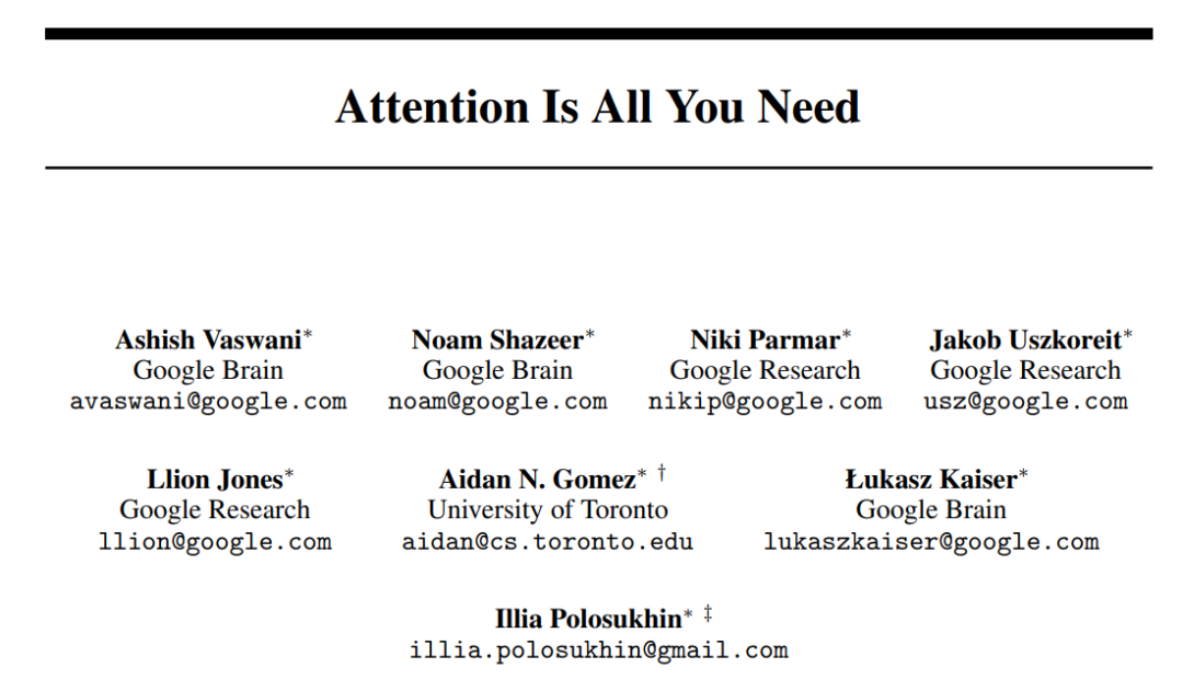 Ashish Vaswani、Niki Parmar 等人 2017 年发表的《 Attention Is All You Need 》。注意:∗ 表示这些研究者做出了不同方面但同等重要的贡献(排名随机)。其中,Ashish 和 Illia 一起设计并实现了第一批 Transformer 模型,并重度参与了 Transformer 架构的各方面工作。Niki 在原始代码库和 tensor2tensor 中设计、实现、调优和评估了无数的模型变量。