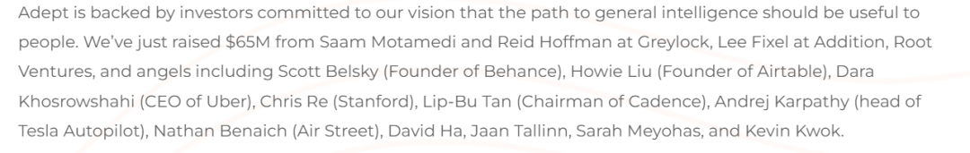 David Luan 透露,目前 Adept 已经拿到了 6500 万美元的融资,Uber CEO Dara Khosrowshahi、特斯拉 AI 高级总监 Andrej Karpathy 等人都是他们的天使投资人。