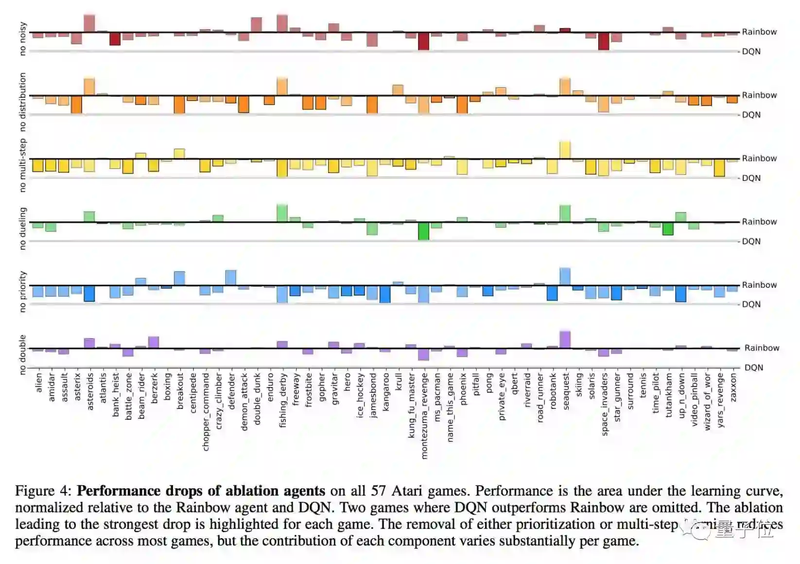 除了和长辈比较之外,DeepMind还尝试了从Rainbow中分别去掉各种算法组件,看会对性能有怎样的影响。