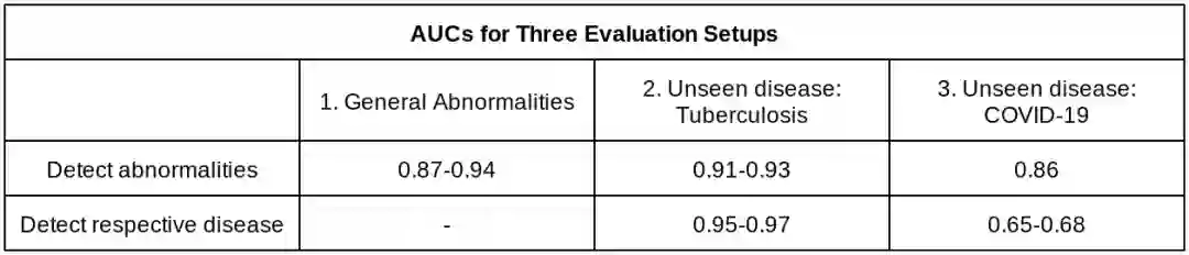 此外需要注意的是,泛化到未知疾病(即结核病和新冠肺炎)和泛化到未知 CXR 结果(例如胸腔积液 、实变 /浸润)之间存在差别。在此项研究中,我们证明了该系统在检测未知疾病方面的通用性,但对于未知 CXR 结果则不具有通用性。