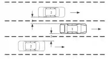 试验车辆以(50+2) km/h 匀速直线行驶,目标车辆在相邻车道匀速直线行驶并保持与试验车辆的横 向距离为(L5±0.3) m,目标车辆以高于试验车辆的速度匀速行驶并超越试验车辆,见图 8。目标车辆跟据表 1 规定场景的车速行驶于试验车辆侧后方,当两车达到试验开始两车纵向距离时,试验开始;当目标车辆的前缘超越试验车辆图 4、图 5 所示 C 线 3m 时,试验结束。