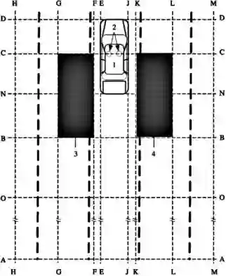 按 6.4.2 进行直线行驶工况试验,当目标车辆处于以下条件所列范围内时(见图 4、图 5),系统应发出左侧盲区警告: