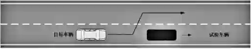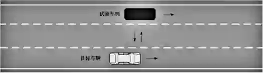试验车辆以(50+2) km/h 匀速直线行驶,目标车辆以(60±2)km/h 同车道驶向测试车辆,见图 9。开始测试时,目标车辆与试验车辆相距大于 20m,当目标车辆距试验车辆图 4、图 5 所示 B 线 10m 时,目标车辆以 0.55m/s~0. 85m/s 的侧向速度从试验车辆侧后方进行变道至两车的横向距离在(1.5+0.3)m。变道完成后,目标车辆保持直线行驶,直至目标车辆完全超越试验车辆的前缘,当目标车辆的前缘超越试验车辆图 4、图 5 所示 C 线 3m 时,试验结束。测试完成后应由试验车辆另一侧重复进行该试验。