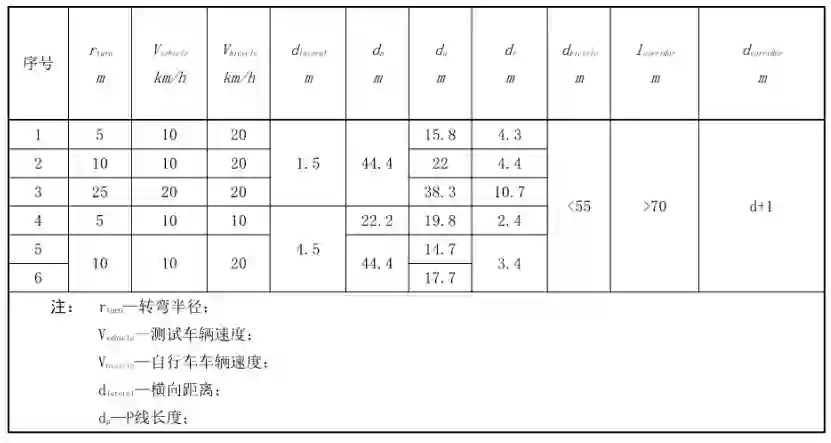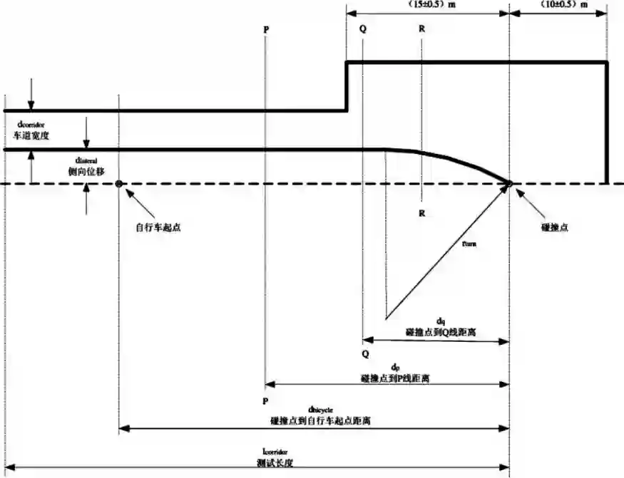 将试验车辆和自行车假人从各自的起始位置按照规定的试验车速进行测试,试验要求试验车辆前缘 在通过图 11 中 Q 线(误差在 0.5m 以内)的同时自行车假人通过图 11 中 P 线(误差在 0.5m 以内), 试验车辆在规定车速(土2km/h 的范围内)向右转向,朝设定的碰撞点行驶。自行车假人以规定的速度, 至少保证自行车假人车速稳定 8s 以上,沿着规定的路线向预定的碰撞点移动。
