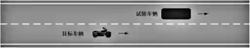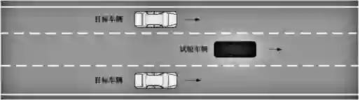试验车辆以(50±2) km/h 匀速直线行驶,目标车辆以(60±2) km/h 在相邻车道匀速直线行驶并保持与试验车辆的横向距离为(1.5±0.3)m,如图 10 所示。开始测试时,目标车辆距试验车辆图 4、图 5 所示 B线纵向距离大于 11m;当最前缘超越试验车辆 C 线 3m 时,试验结束。