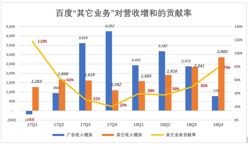 百度正在逐步改变收入来源单一的境况,2019年广告收入占比大概率降至80%以下。