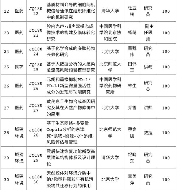 23日,北京市自然科学基金委员会办公室正式发布2018年度北京市自然科学基金杰出青年科学基金拟资助项目公告,决定资助30个项目,项目资助期限为3年,资助强度100万/项,总计3000万元资助项目经费。
