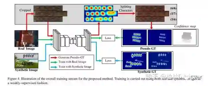 训练在一个弱监督学习的方式下,有人造合成的数据集具有字符级别的label,real image没有字符级别的标注时,自己检测合成产生label再进行训练。如上图所示,对真实场景中的数据集和人造合成的数据集有不同的训练方式。