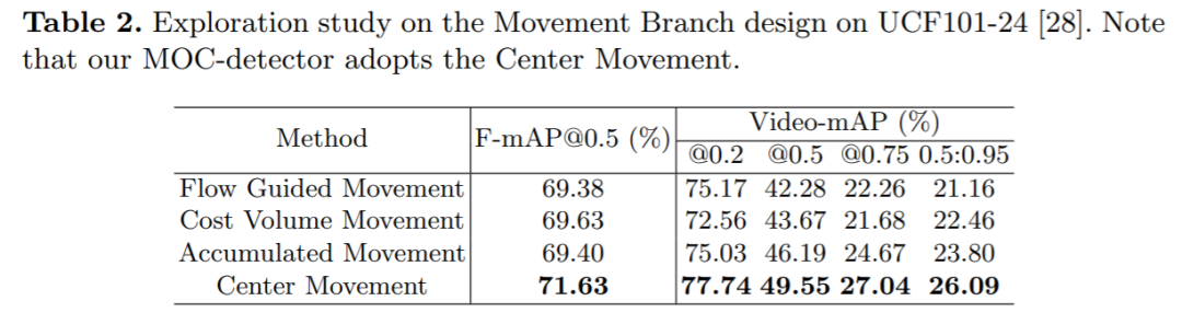 我们分别尝试了用光流和costvolume来代替网络估计Movement,同时也尝试了估计相邻帧之间的movement(MOC估计的是到key frame的movement),通过累积的方式得出中心点运动轨迹,发现MOC中用的方式最高效。