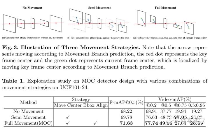 Movement Branch影响了bbox的位置和大小,我们对其有效性进行了探究。Movement Branch将key frame的中心点移动到其他帧来定位bbox的中心点位置,被称为Move Center策略。Box Branch在当前帧的中心点而不是在key frame中心点估计的bbox的大小,被称为Bbox Align策略。我们将MOC和另外两个detector,No Movement和Semi Movement进行对比。如上图所示,No Movement直接去掉了Movement Branch,所有帧都在key frame的中心点生成bbox;Semi Movement首先在key frame的中心点生成bbox,然后根据Movement Branch的轨迹预测结果对框的位置进行调整,Full Movement是MOC采用的方式,Full Movement和Semi Movement的区别就在于Full Movement是在每帧对应中心点估计框大小,而Semi Movement是在key frame的中心点估计框大小。通过No Movement和Semi Movement的对比我们可以看出Movement分支的必要性,并且movement对于video AP的影响更大,因为在link算法的过程中,单帧造成的误差会逐渐积累,造成video AP受到了很大的影响。Semi Movement和Full Movement差距较小,可以证明我们的Box Branch比较鲁棒,估计bbox size时微小的位置扰动不会干扰太多Box Branch的结果。
