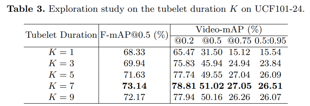 我们改变输入长度进行探究,发现K=1时,MOC变为一个frame-level的detector,效果差了很多尤其是video mAP,验证了tubelet detector确实效果更优。并且发现K=7的时候效果最好,在MOC模型中我们设置K=7。