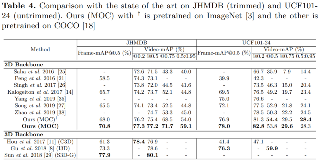 我们将MOC和其他方法的结果在UCF101-24和JHMDB上进行对比,[23. 19. 24]都是frame-level的detector,[12, 32, 35, 25]是tubelet-level的detector,我们的方法均优于这些方法,尤其是对于high IOU video mAP,可见我们的anchor-free tubelet detector MOC可以比anchor-based tubelet detector更精确地从短时序视频片段中定位动作。我们和基于3D backbone[9, 7, 27]的方法效果差不多,这些方法通常将action detection分为两个步骤,person detection (ResNet50-based Faster RCNN pretrained on ImageNet) 和action classification (I3D/S3D-G pretrained on Kinetics+ROI pooling),和tubelet detector相比无法提供一个简单的框架。